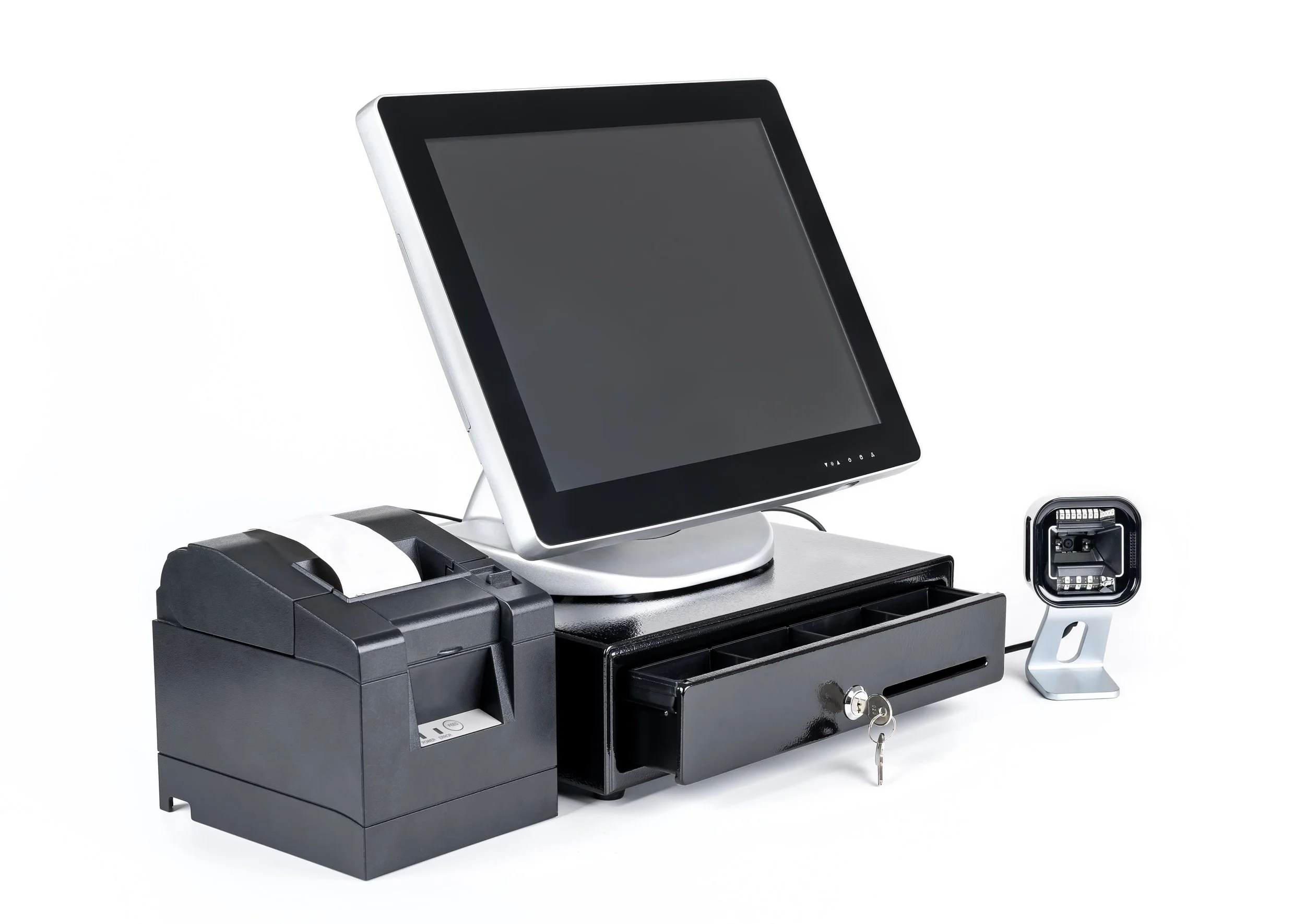 Point of sale cash register system with a monitor, receipt printer, cash drawer, and barcode scanner.