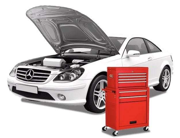 A white Mercedes-Benz convertible with its hood open next to a red rolling tool chest.